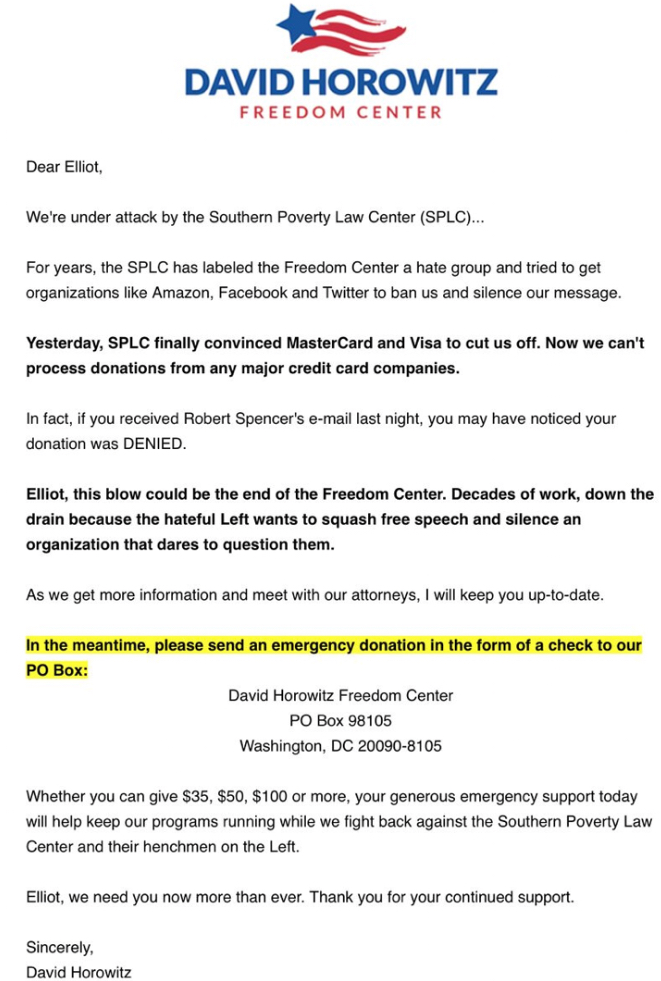 “The David Horowitz Freedom Center has had its ability to accept credit card donations restored”