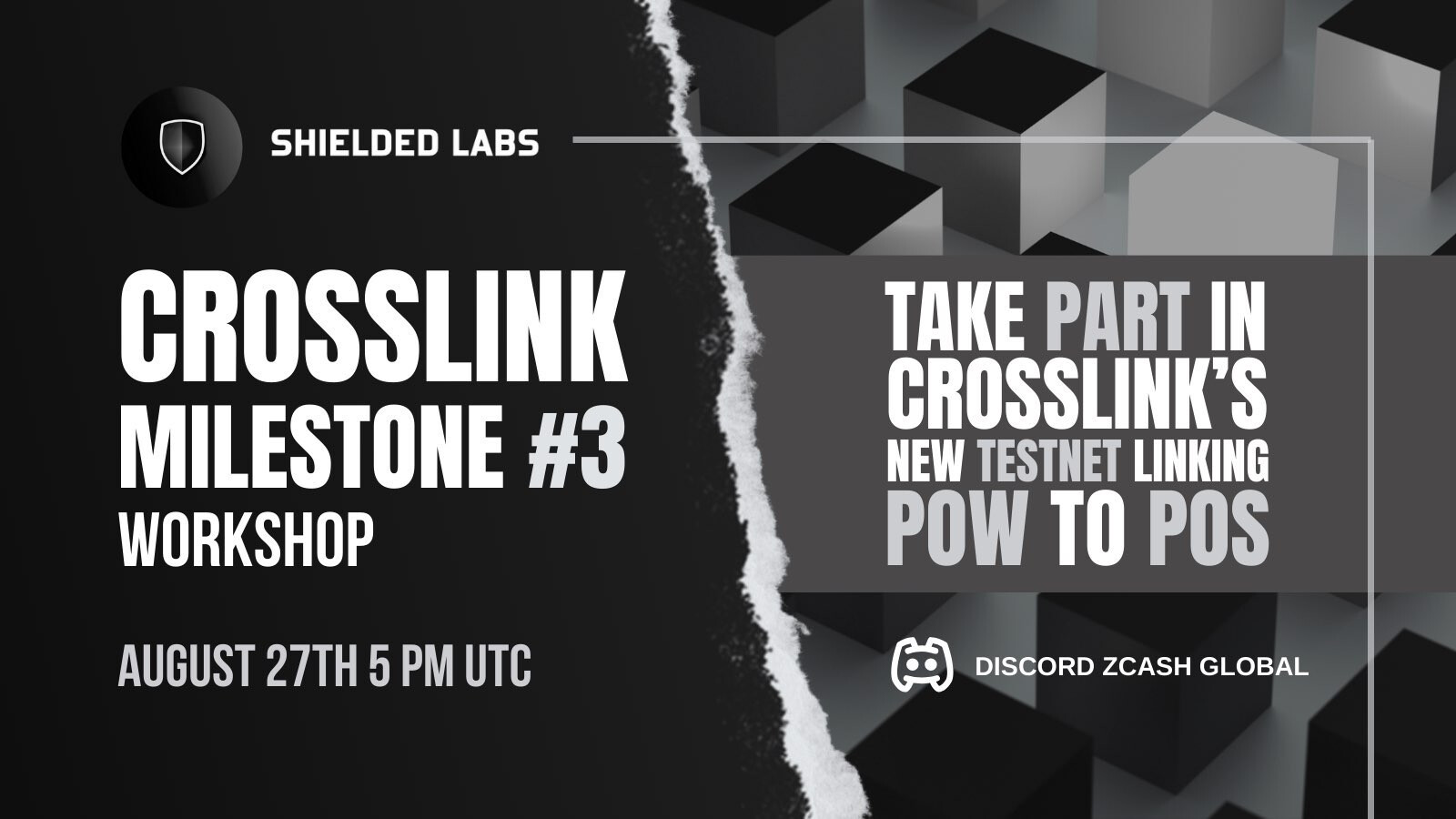 On Wednesday, August 27 at 10AM PST / 1PM EST / 5PM UTC, Shielded Labs will host an interactive workshop on the Zcash Global Discord to mark the completion of Crosslink’s Milestone #3. In our last workshop, we demonstrated the link from the PoS chain to PoW. This time, we’ll introduce the reverse connection - from PoW to PoS - demonstrating the “cross-link”!