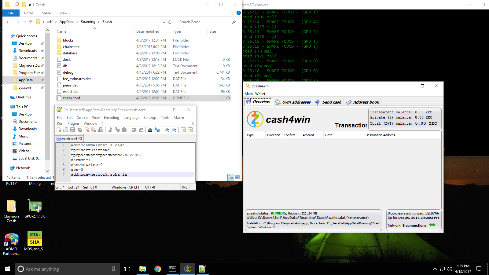 2017-04-09 05:37:35 Using config file C:\Users\Jeff\AppData\Roaming\Zcash\zcash.conf